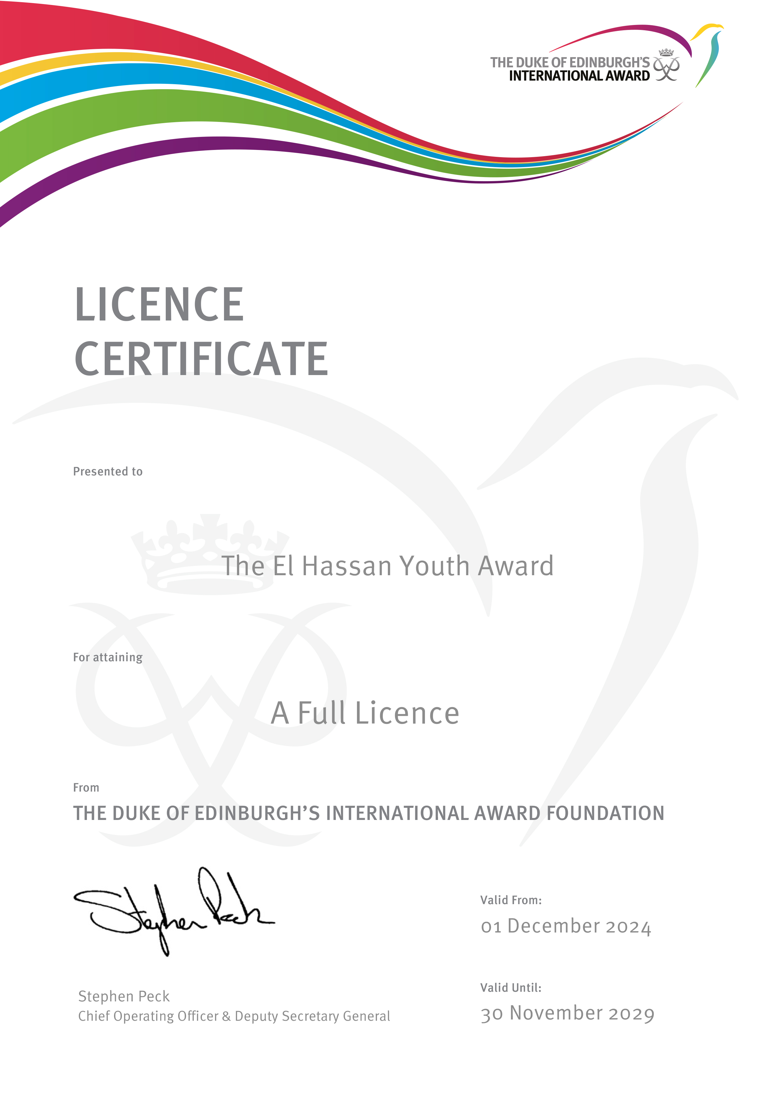 حصلت الجائزة على الترخيص الكامل من جائزة دوق إدنبرة الدولية للفترة 2024–2029، لتكون واحدة من ثلاث عشرة دولة فقط على مستوى العالم حاصلة على هذا الترخيص، تأكيدًا على جودة برامجها وكفاءة تطبيقها للمعايير العالمية..