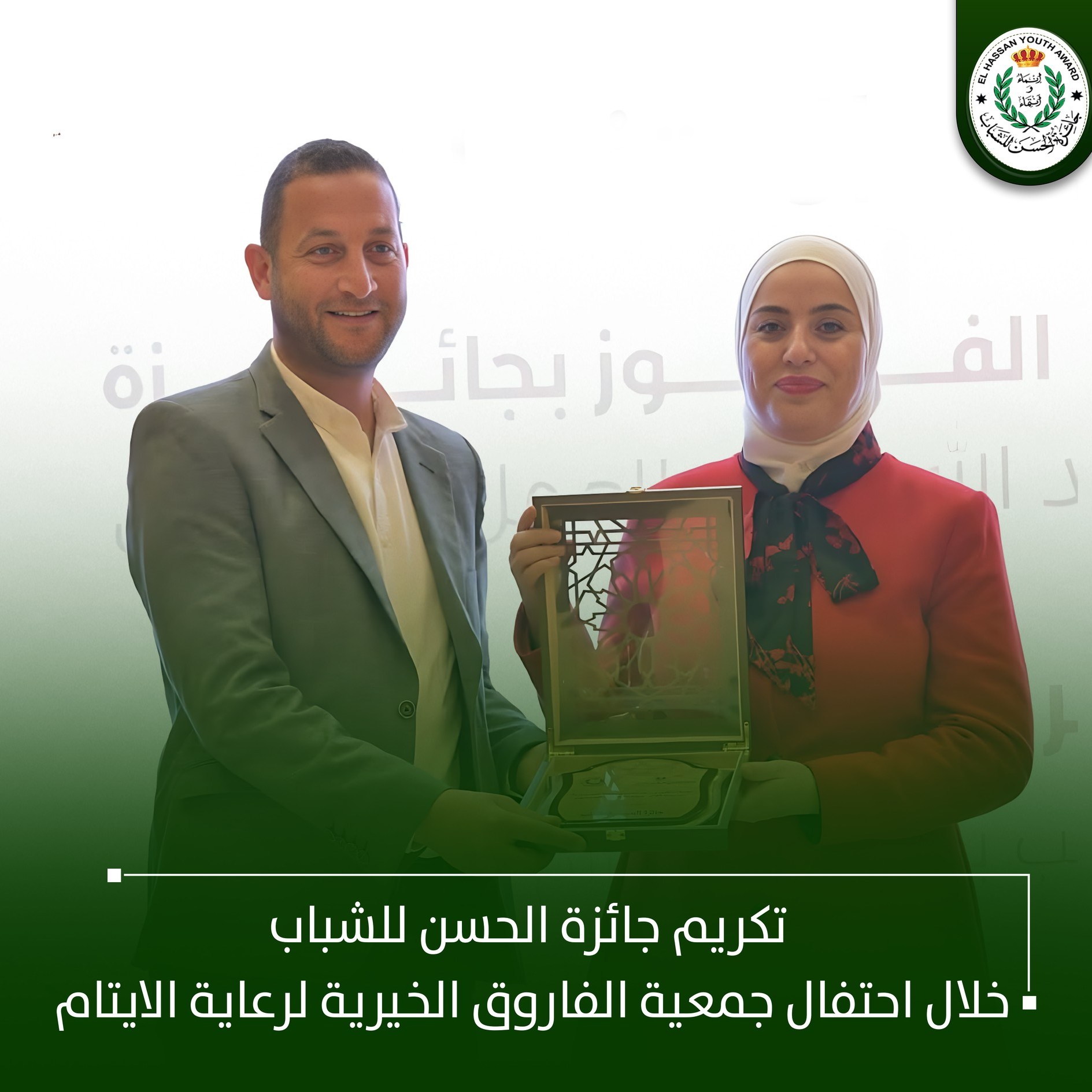تشرّفت جائزة الحسن للشباب بالتكريم خلال احتفالية جمعية الفاروق الخيرية لرعاية الأيتام، بمناسبة فوزها بـ جائزة الحسين للعمل التطوعي – المركز الأول، في إنجاز وطني نفخر به، ويعكس مسيرة حافلة بالعطاء والعمل الخيري والتطوعي وخدمة الأيتام والمجتمع المحلي.