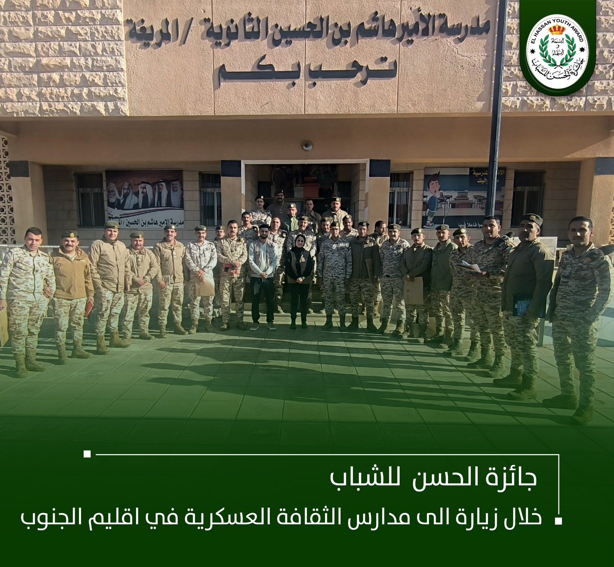 نفذت جائزة الحسن للشباب زيارة تعريفية ومتابعة للمدارس التابعة لمديرية الثقافة العسكرية / إقليم الجنوب، بمشاركة 26 مدرسة و53 قائد جائزة، وذلك في مدرسة الأمير هاشم بن الحسين الثانوية / المريغة، بحضور رئيس شعبة الشؤون التعليمية في إقليم الجنوب الدكتور المقدم زيد السعيدات ومديرة الجائزة الدكتورة خولة الحسن.